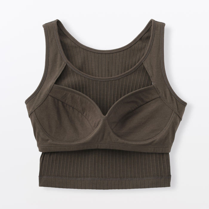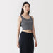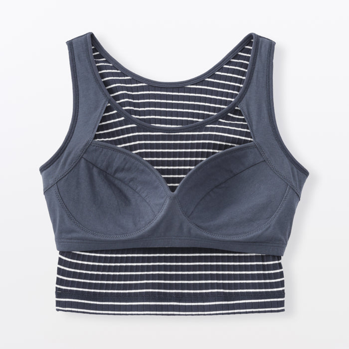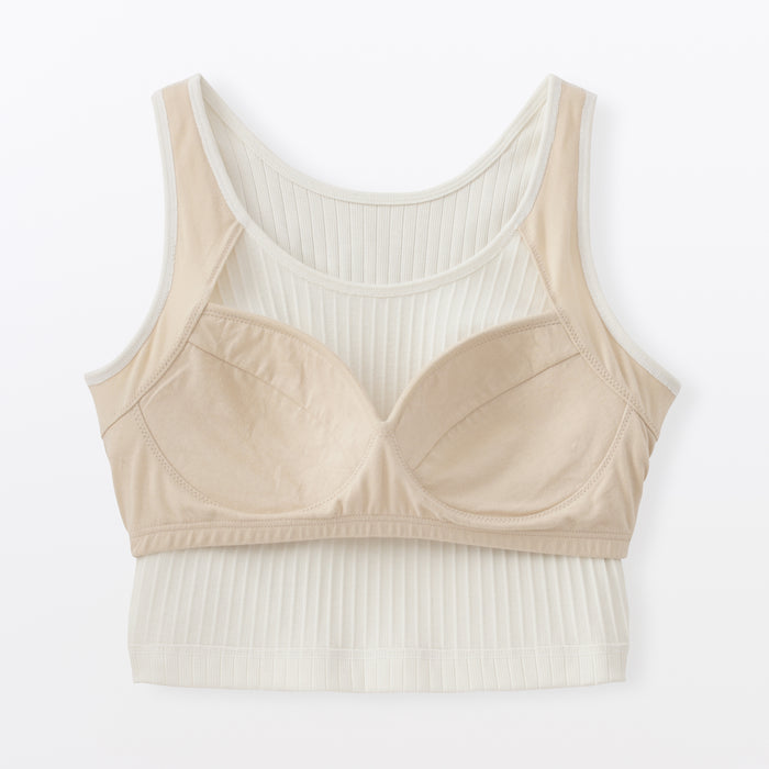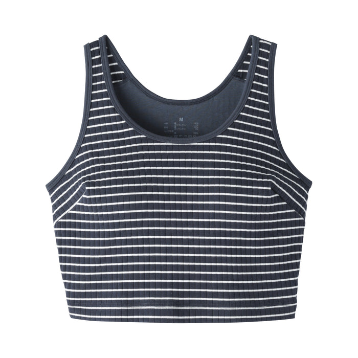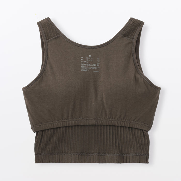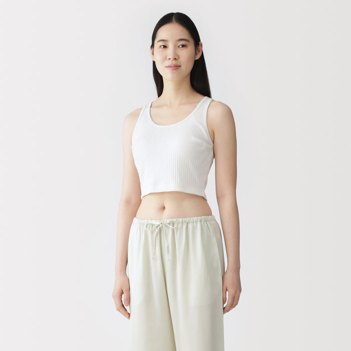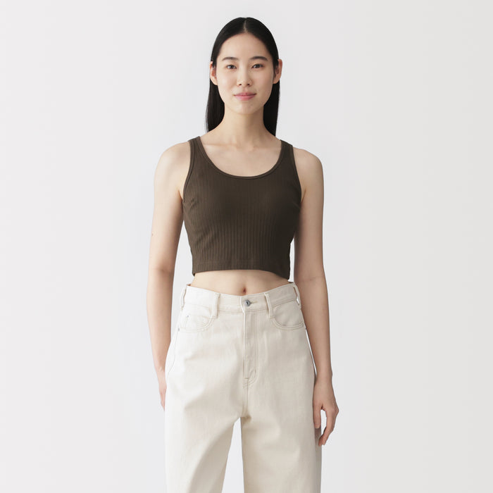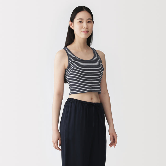 A cropped tank top with a built-in bra so you only need to wear one layer. Made with stretchy organic cotton, the material is soft and comfortable to wear on warm days.