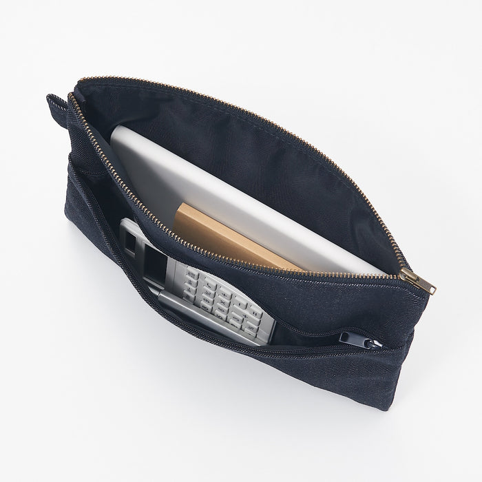 A flat pouch with 2 pockets for storing writing utensils, and other small stationery items. Made from a durable denim fabric.