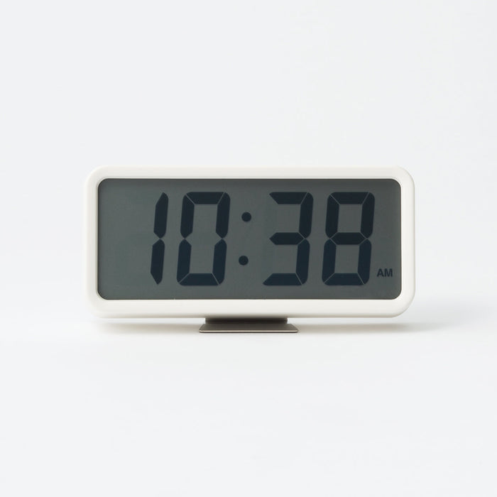 A digital clock with a simple design, focused on making a clock that is easily readable from any angle. It can be set to either a time or date display. This model can be used on a desk with the included stand, or hung up on the wall.