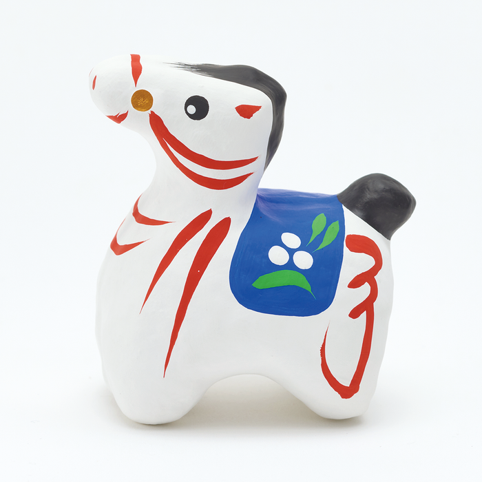 A papier mache horse with a combination of a simple adorable look and unique decorative patterns is created by Hikoji Mingei, a producer of zodiac folk dolls called Miharu Koma (wood carving), and also one of the workshops in Takashiba Deco Yashiki, a village where Miharu folk toys have been made since the Edo period. It is believed to bring prosperity to families and success in business.