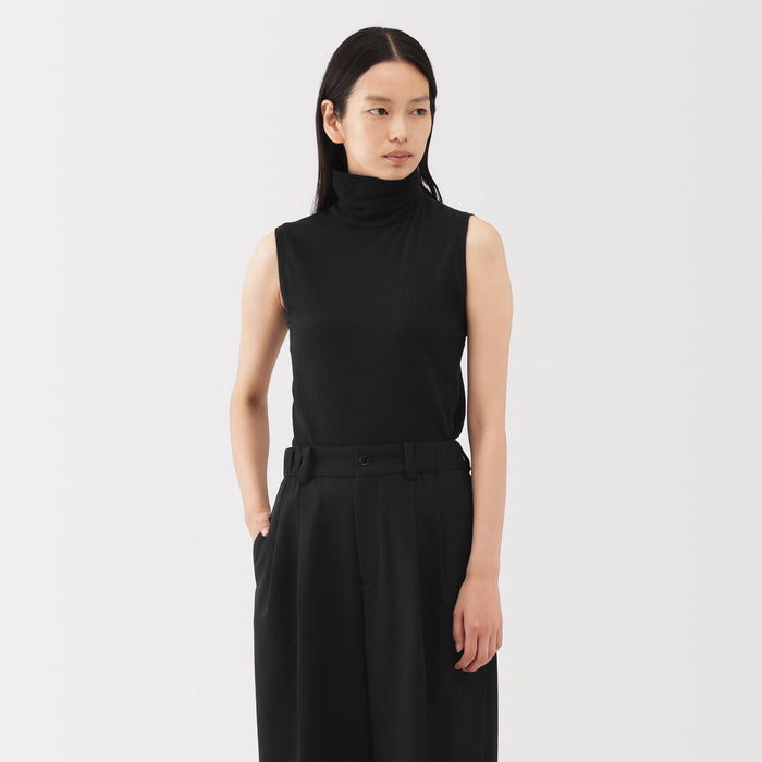 A comfortable sleeveless turtleneck undershirt made of lightweight T-shirt jersey material that combines the suppleness and durability of extra-long staple cotton with the smoothness of cashmere to create a soft and smooth texture. The cashmere blend allows for moderate elasticity and stretch, and it's just the right thickness for either wearing on its own or layered underneath a sweater or jacket.