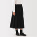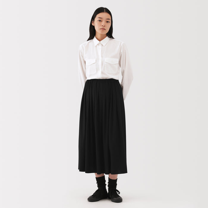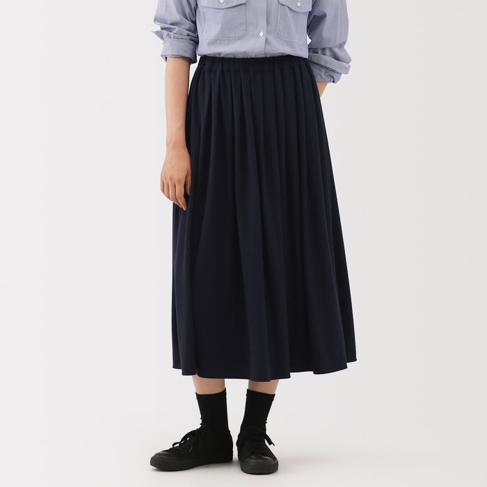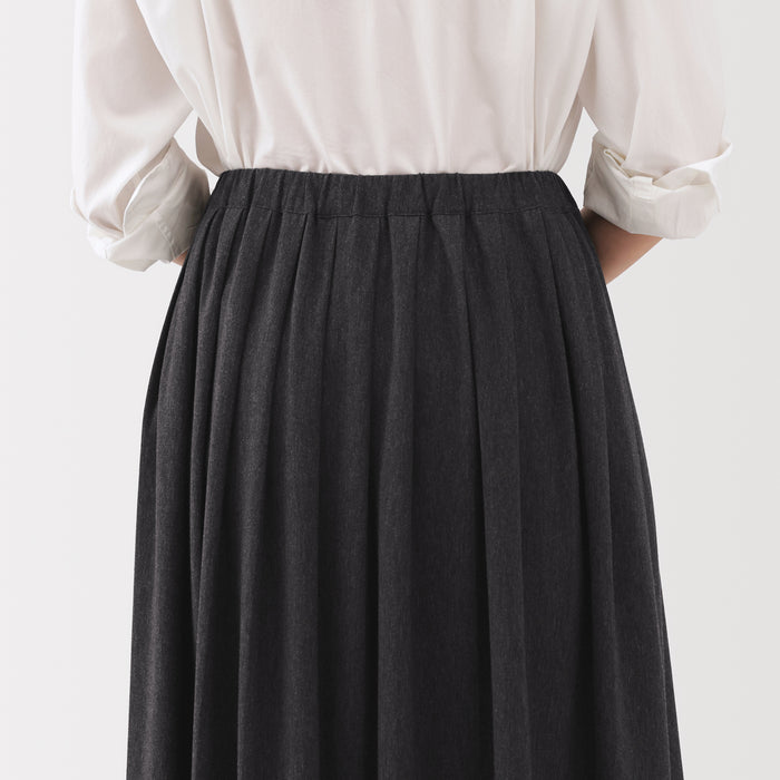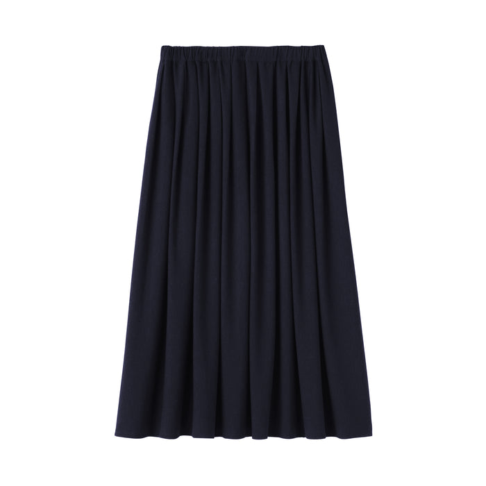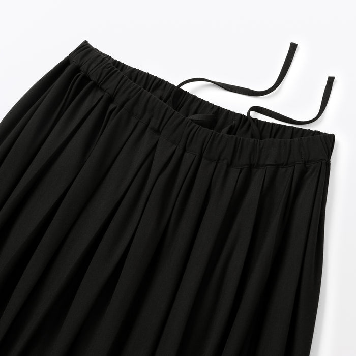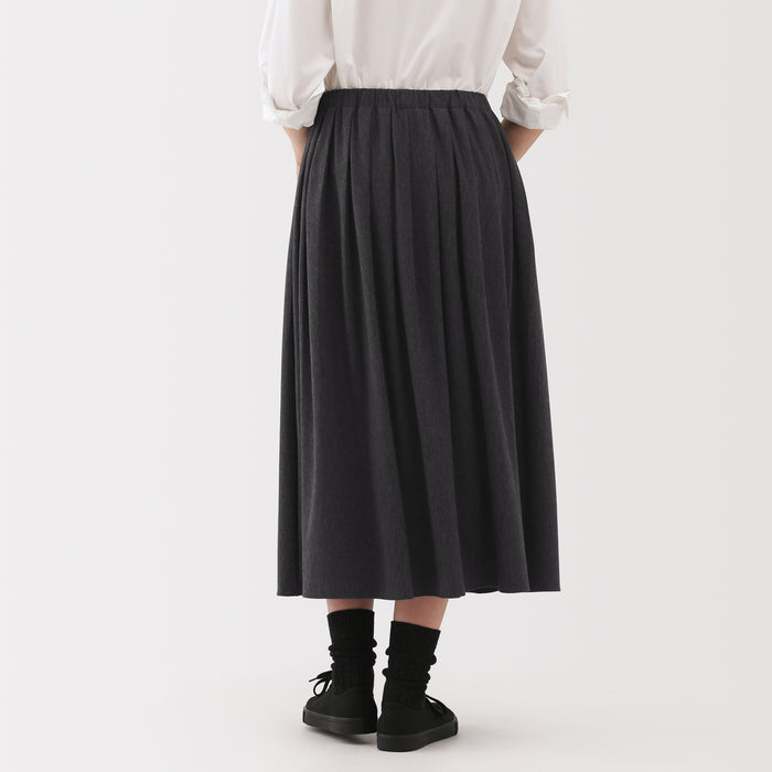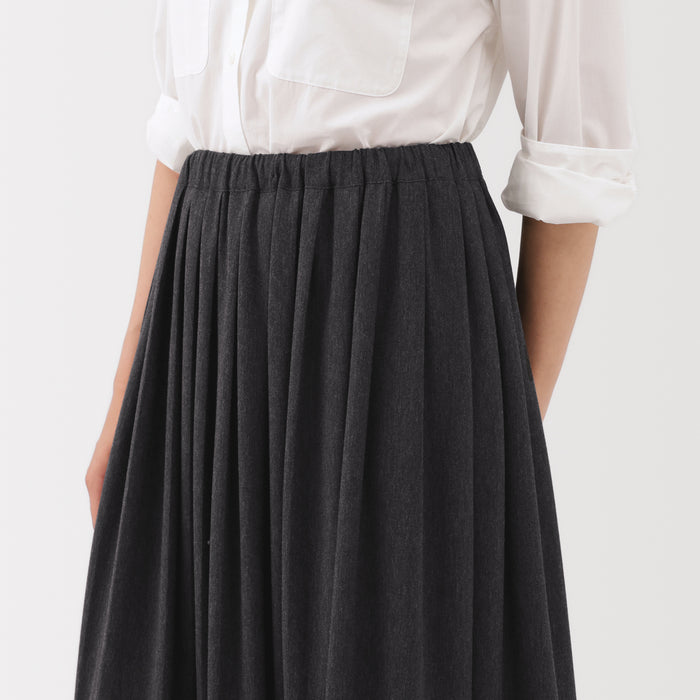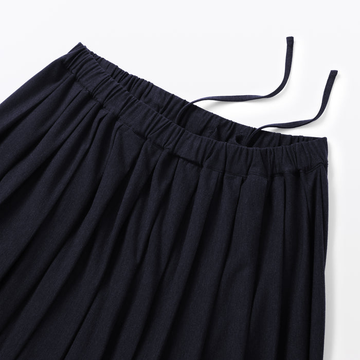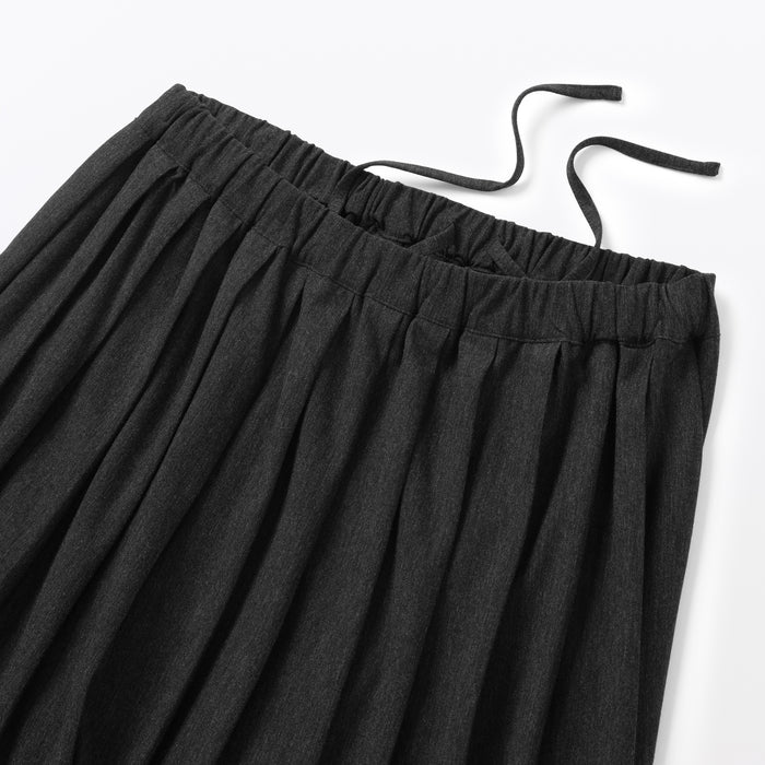 Instead of the standard pleating of woven fabrics, this skirt features pleats that disappear toward the hem. Random pleating creates a flattering three-dimensional effect and allows for ease of movement. The waistband has an internal drawstring for an adjustable fit.