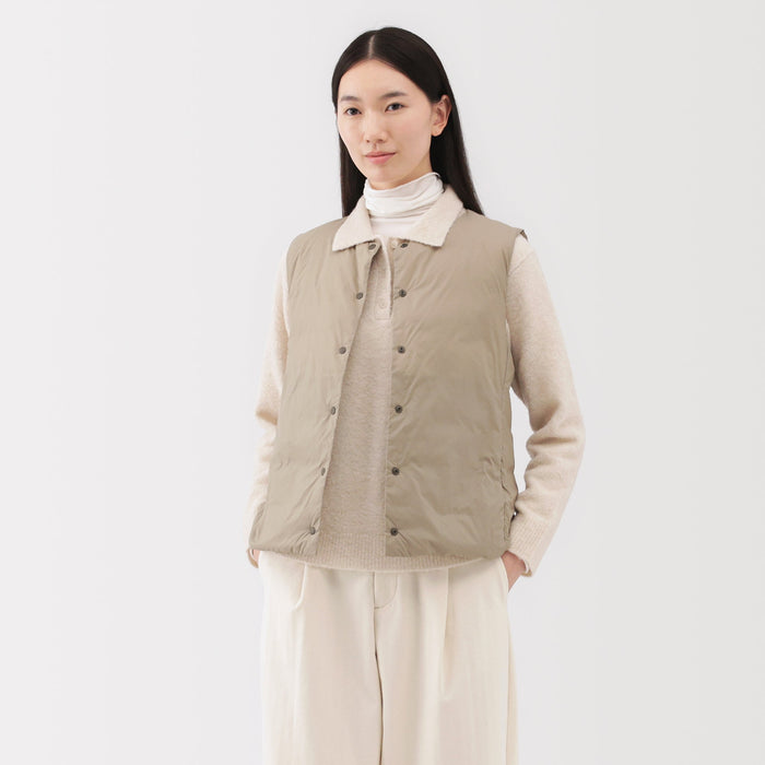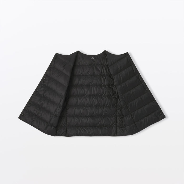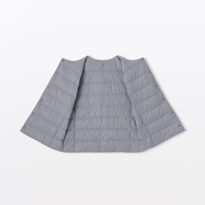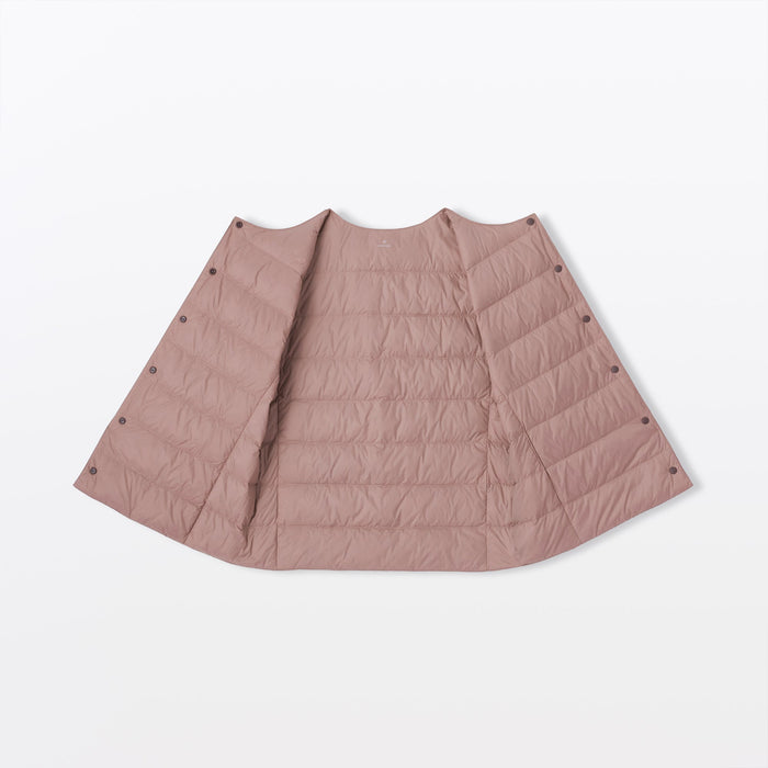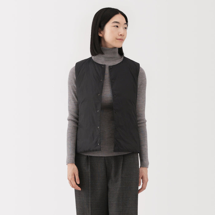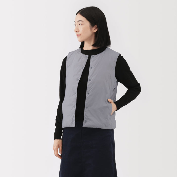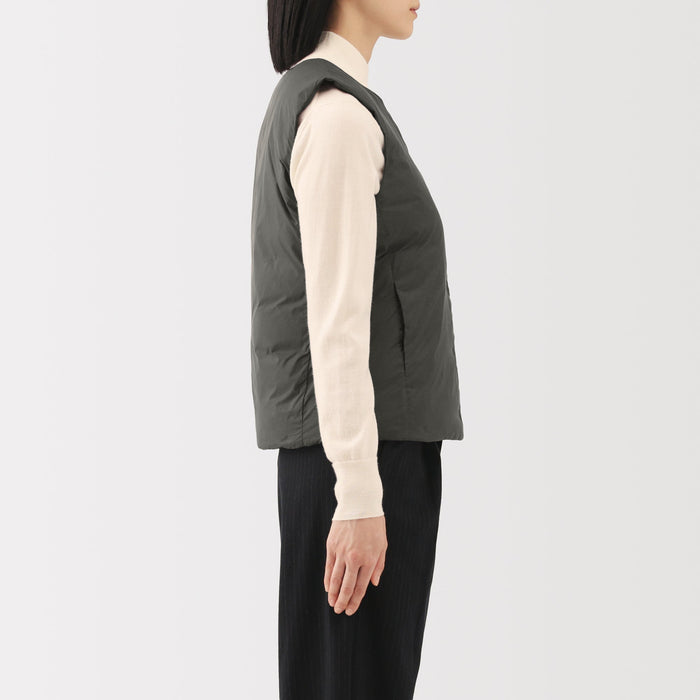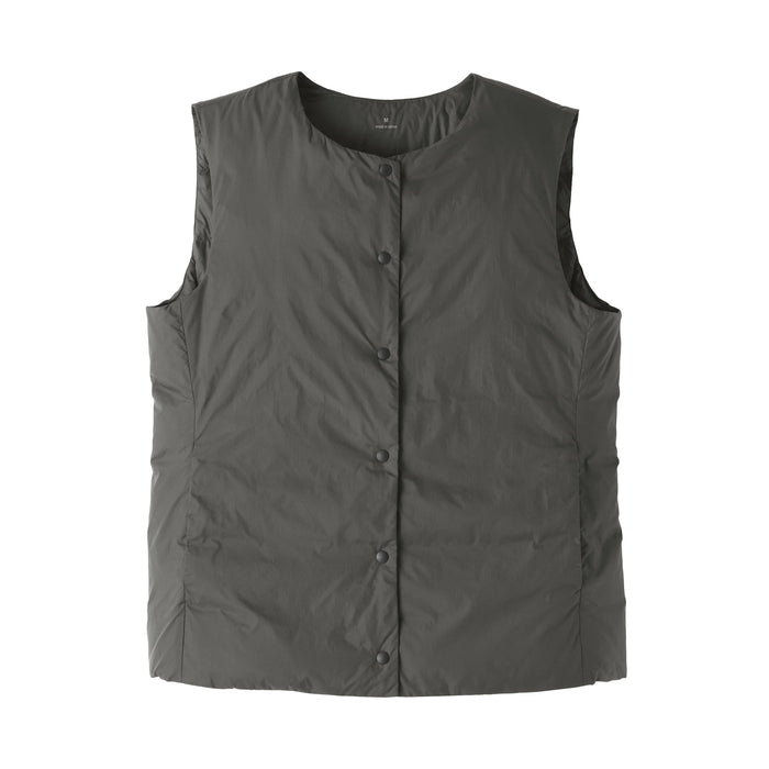 A women's lightweight down collarless vest made with recycled nylon fabric and fill power 750 down. Designed to be foldable and easy to carry. Thick and light enough to be layered in the winter.