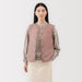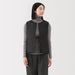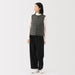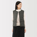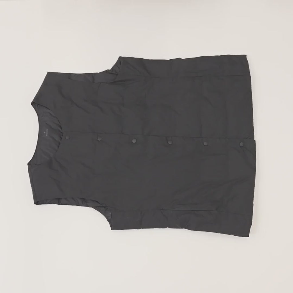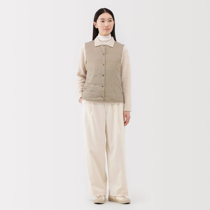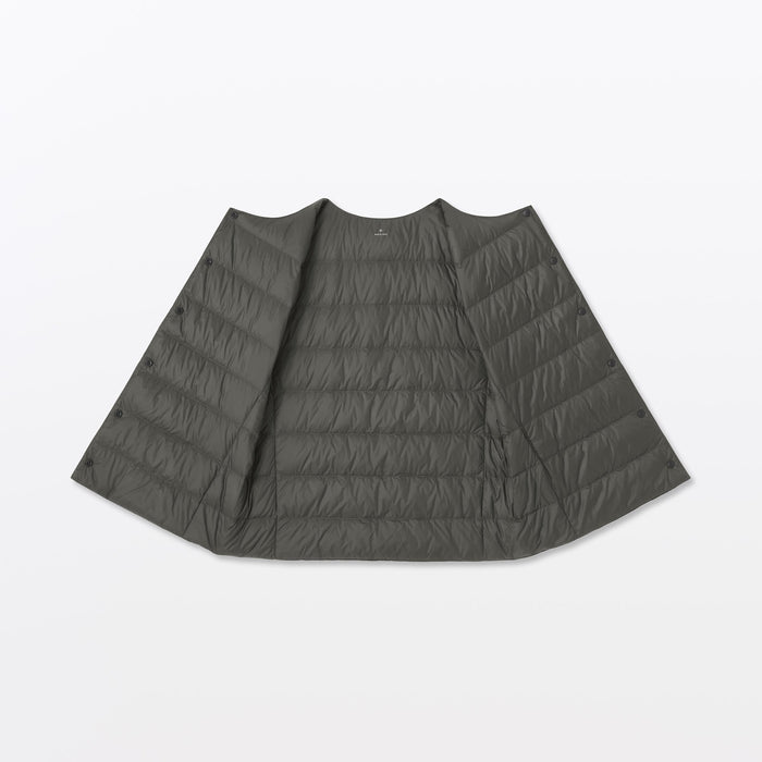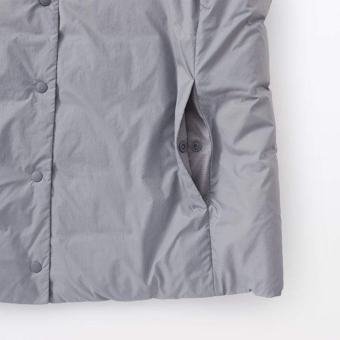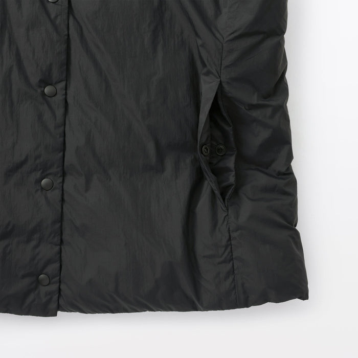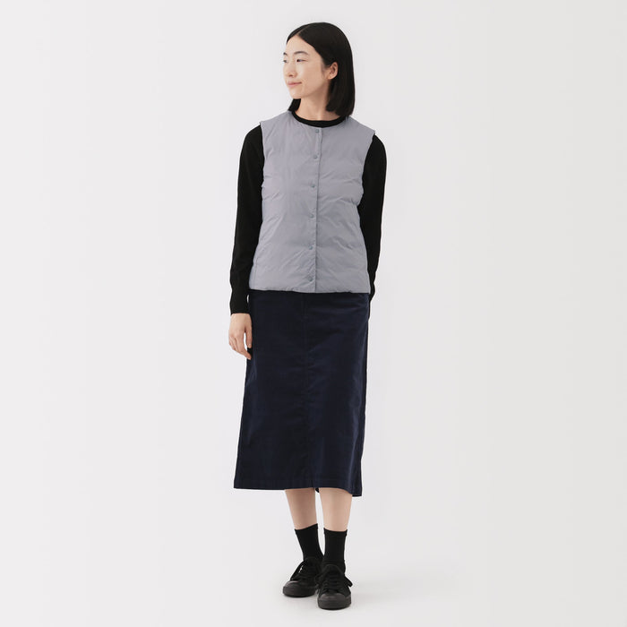 A women's lightweight down collarless vest made with recycled nylon fabric and fill power 750 down. Designed to be foldable and easy to carry. Thick and light enough to be layered in the winter.