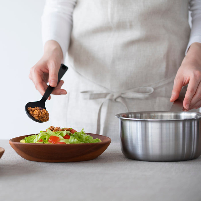A lightweight linen apron featuring an adjustable cross-shoulder strap. It comes with 2 pockets from the side to the back so that it is easy to bend and stretch even if there is something in the pockets when crouching. It can be stored in a pouch that is included.