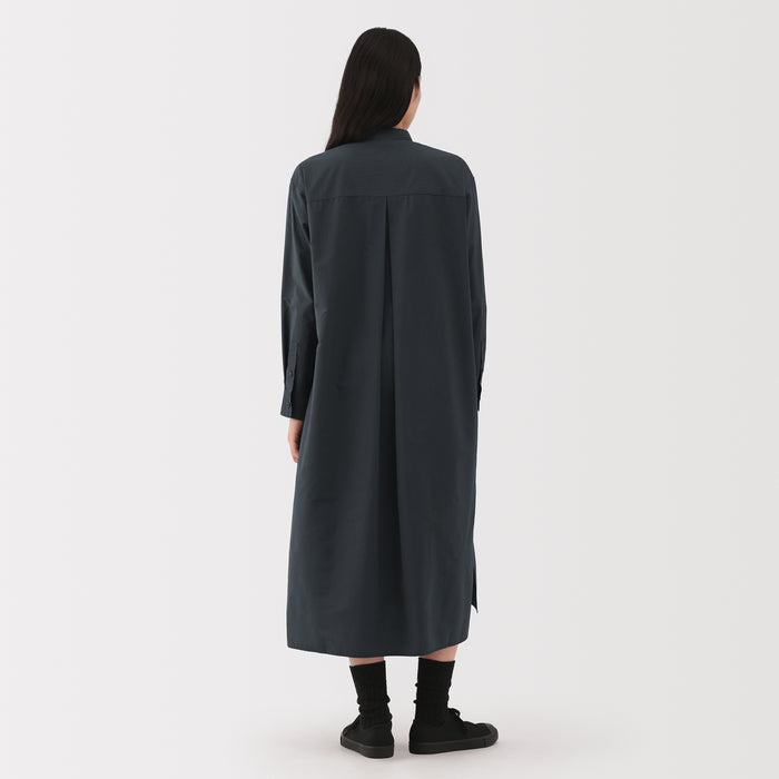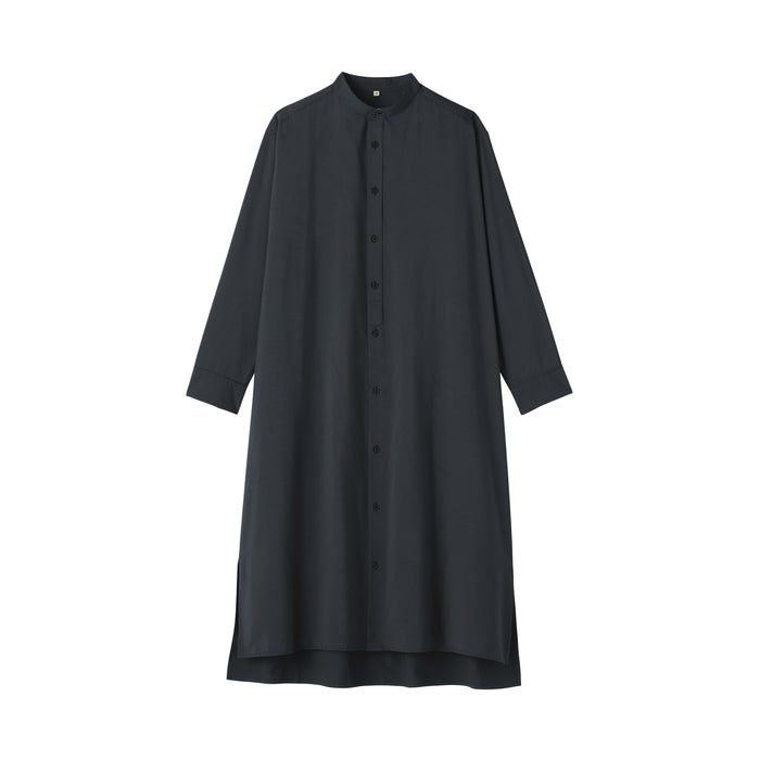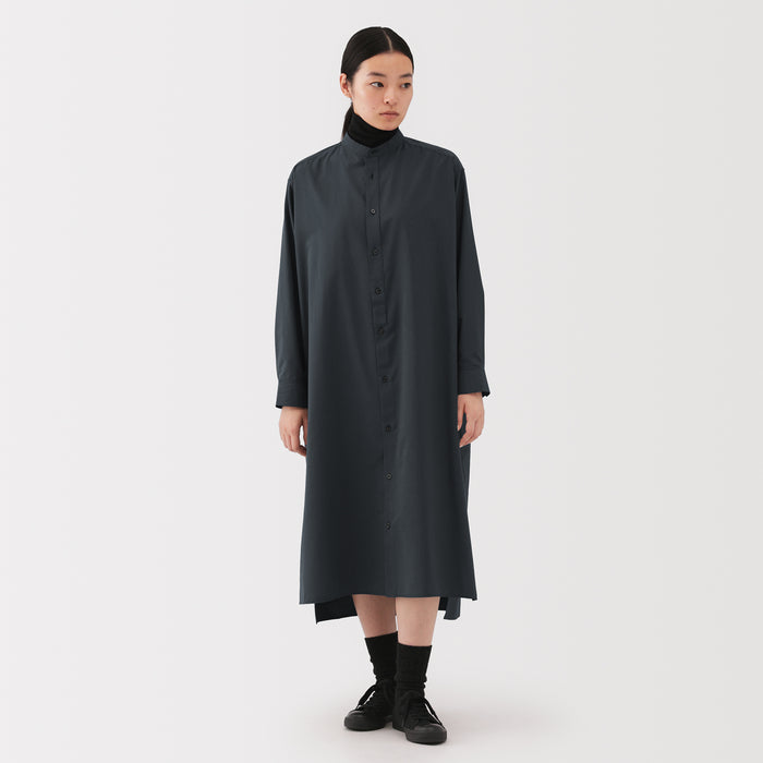 This button-up women's shirt dress is made partially with plant-based materials and features a boxy, relaxed fit. The front of the dress is slightly shorter than the back for an interesting silhouette.