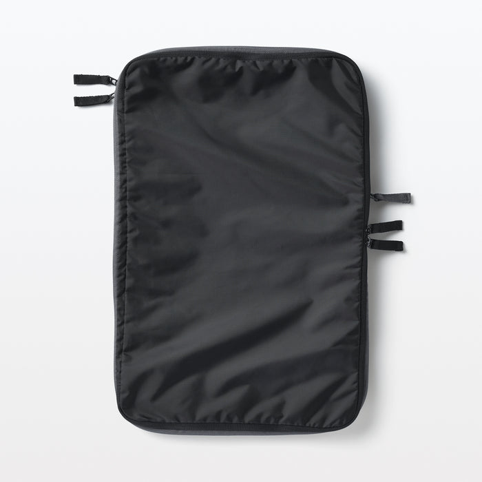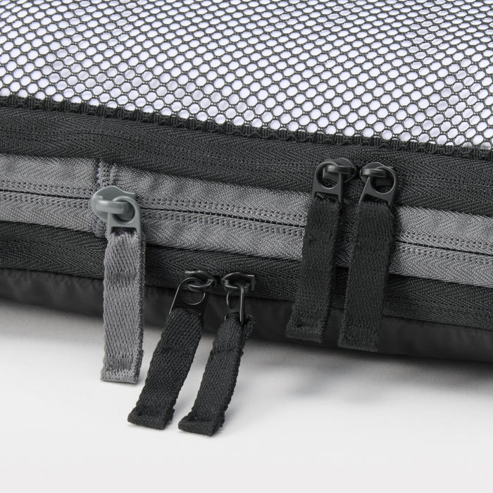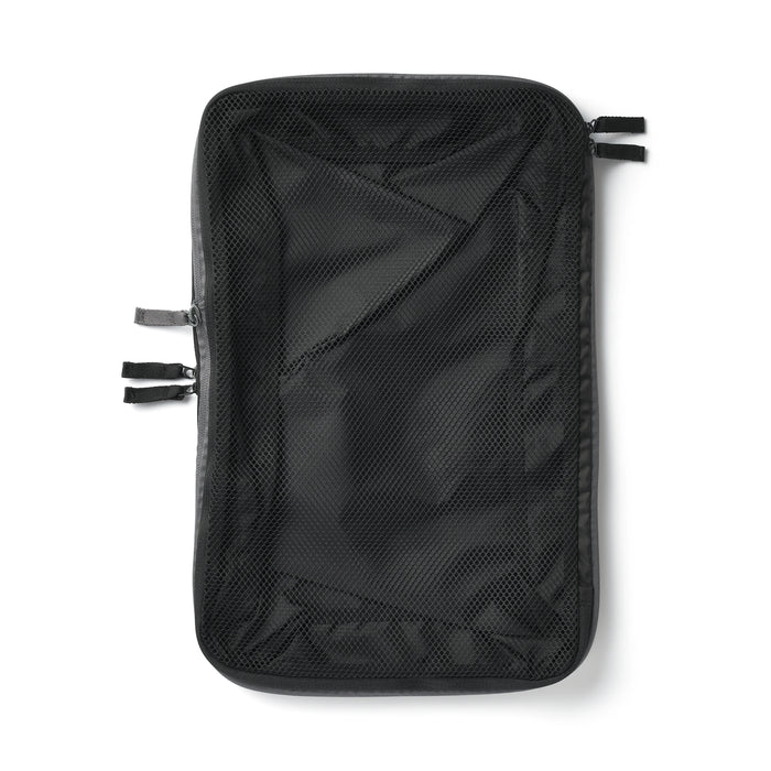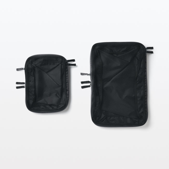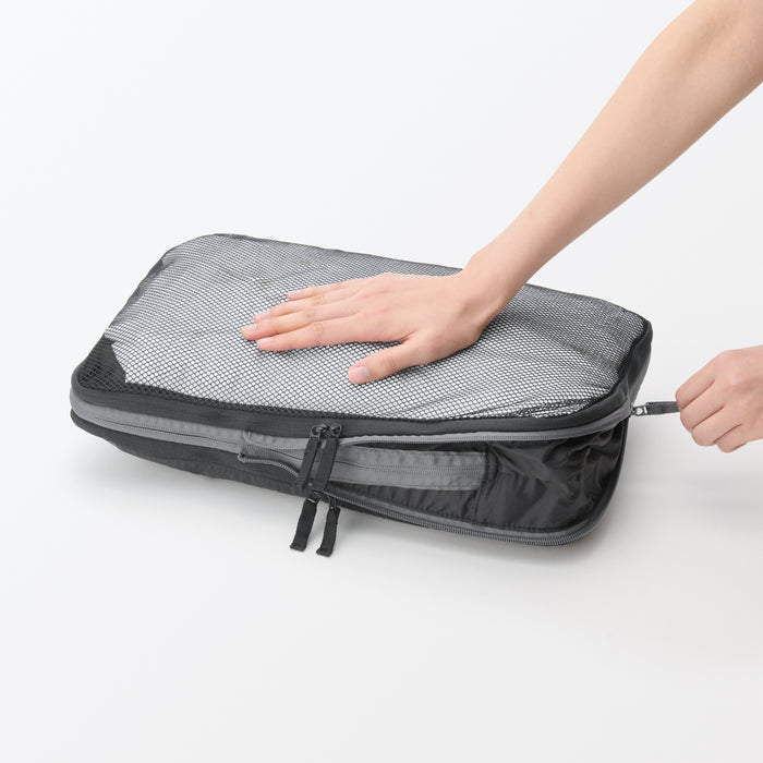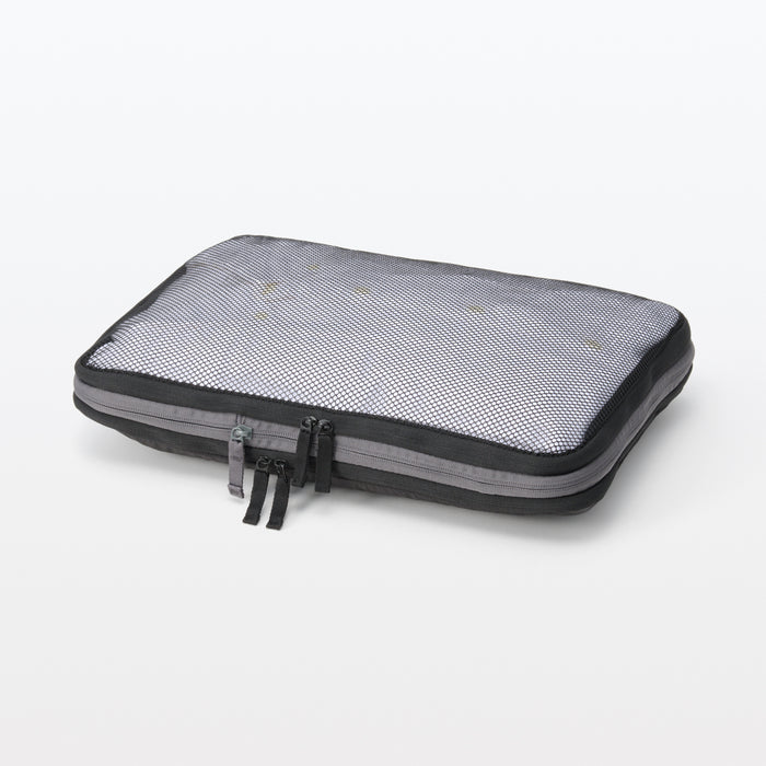 A travel case made from a durable and lightweight mesh fabric. Simply close the zipper in the middle to compress its contents for more efficient packing and reducing overall bulk. The mesh on one side allows you to easily preview the contents, making it great for organizing clothing inside of suitcases for travel.