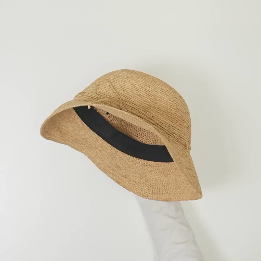 This capeline hat is perfect for sunny days, with a wide brim that gives you extra sun protection and blocks over 90% of UV rays. Made by hand-knitting raffia from Madagascar. It can be folded and tied conveniently with the ribbon for easy storing, making it great for taking with you wherever you go without taking too much space. A hidden strap on the inside allows for size adjustment.