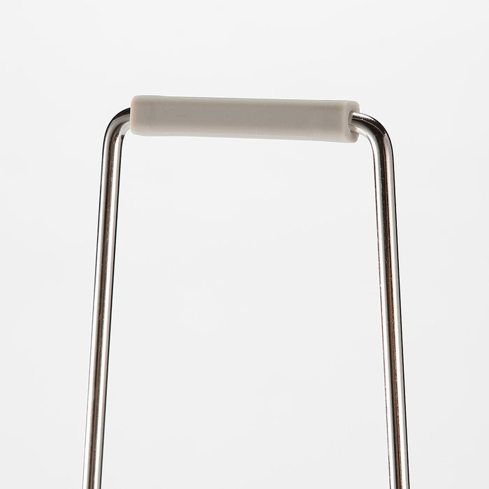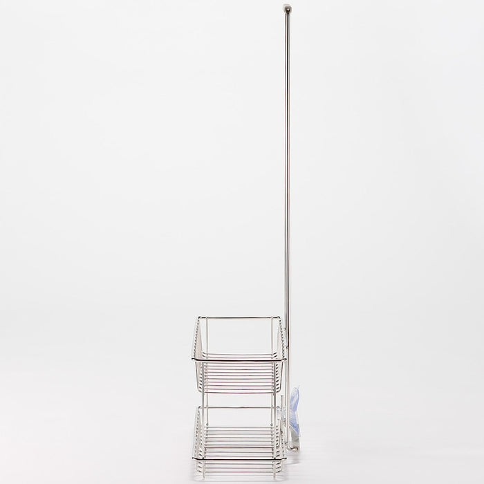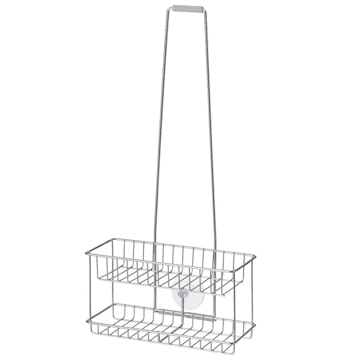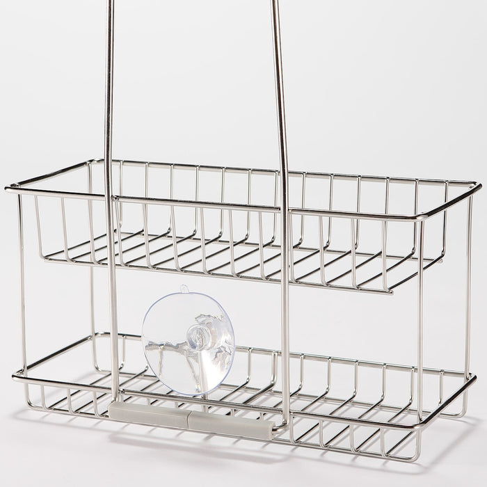 An over the shower rack made of durable steel. Perfect for small shower accessories or items that need to drain water. Features a silicone suction cup for added stability.