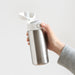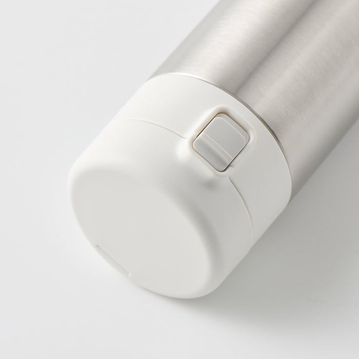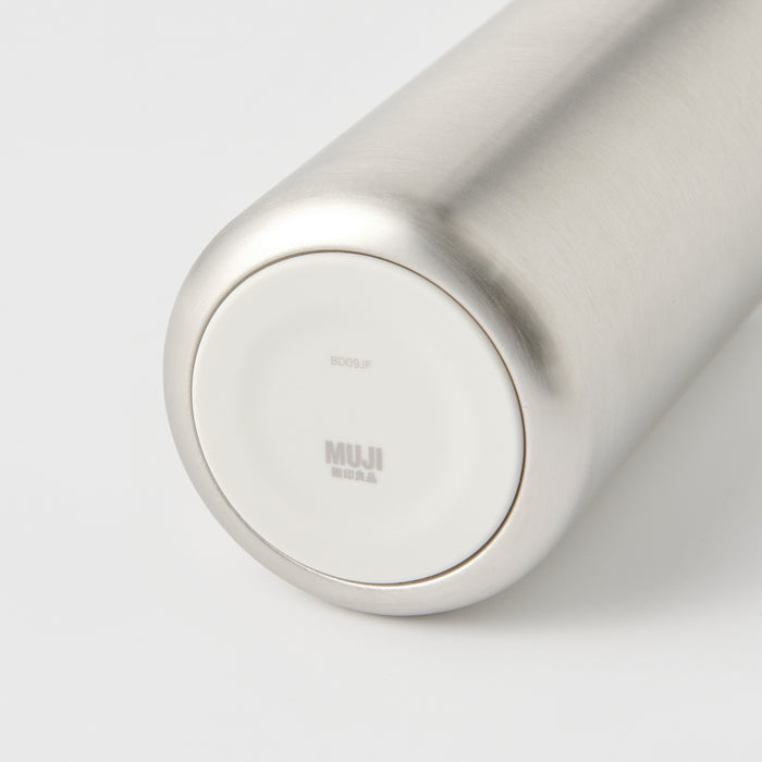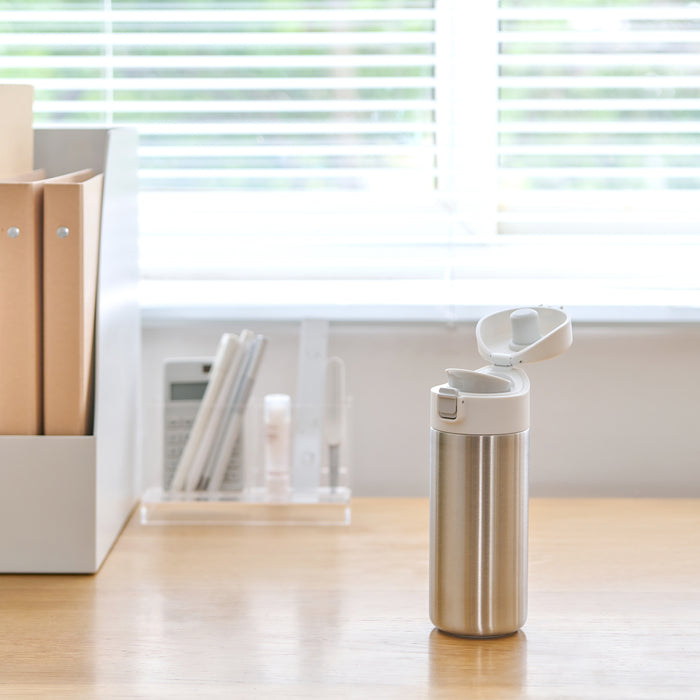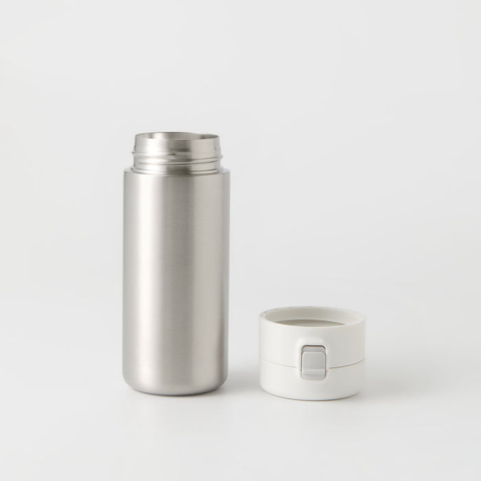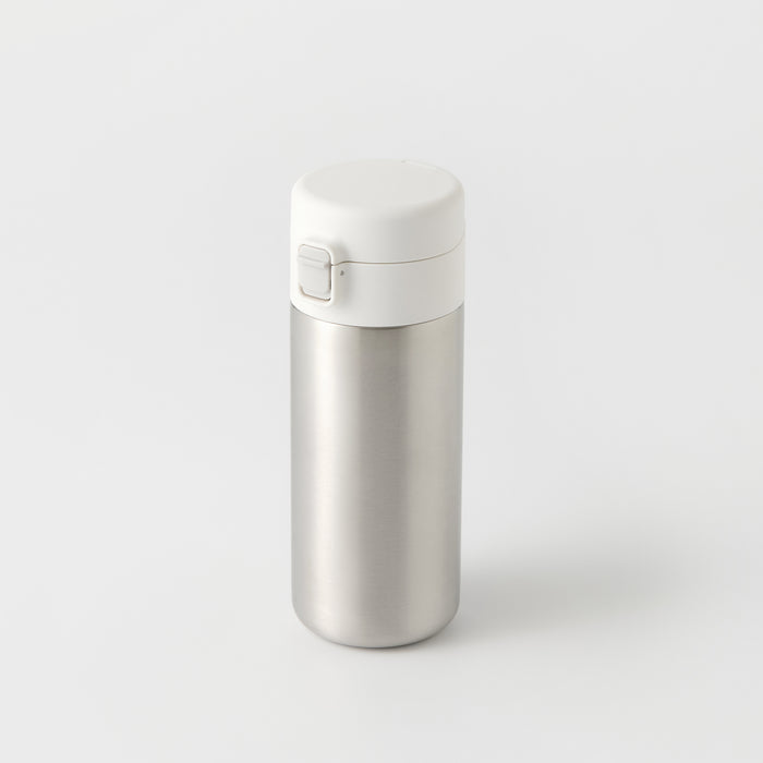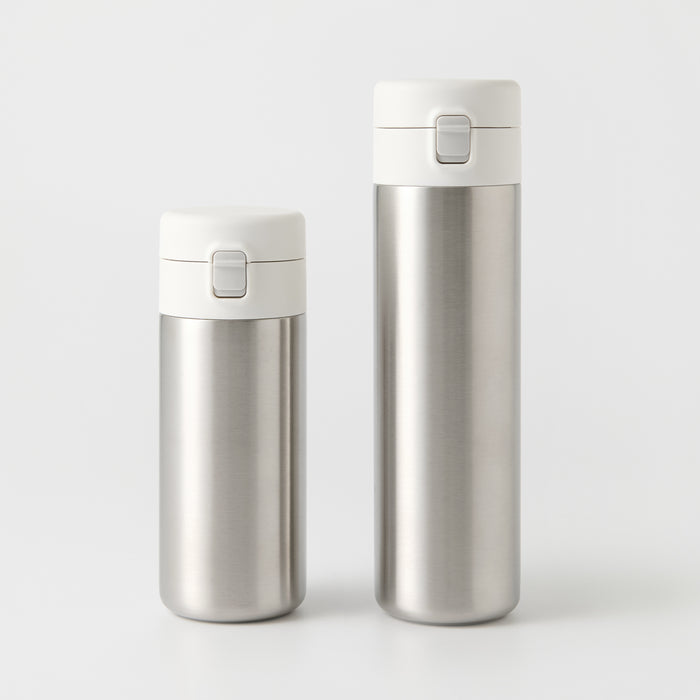 A compact water bottle made from stainless steel that can retain heat or stay cold for a period of time. It is designed in a way so it's easy to carry around, and easily fits in the bottle compartment of most backpacks.
