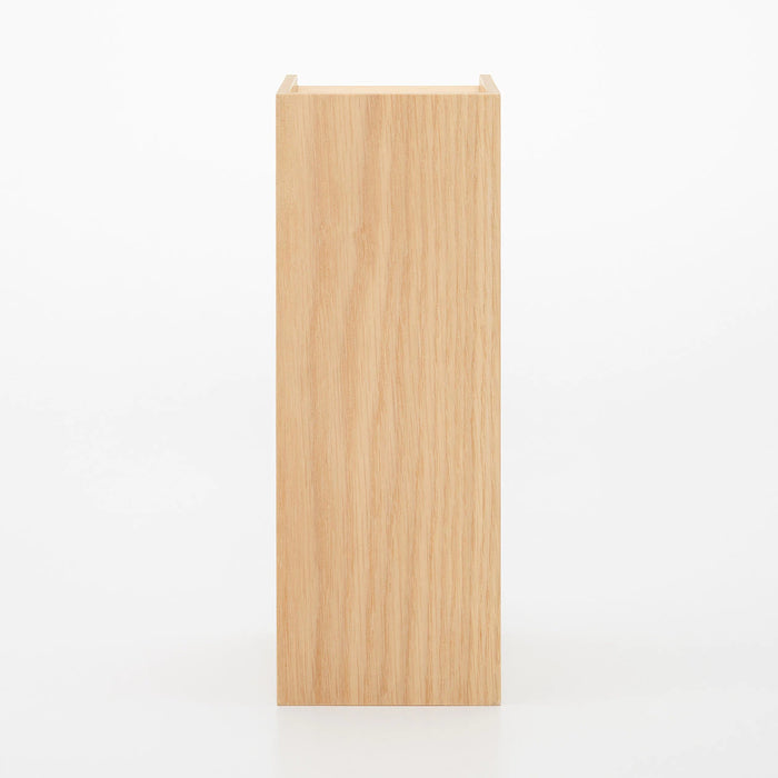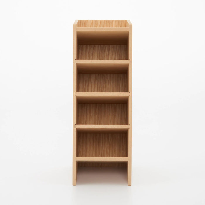 The surface is finished with oak to fit in with the interior environment. The partition is slanted so that it is easy to see to the back and small items do not fall out. The three-stage partition inside is movable.